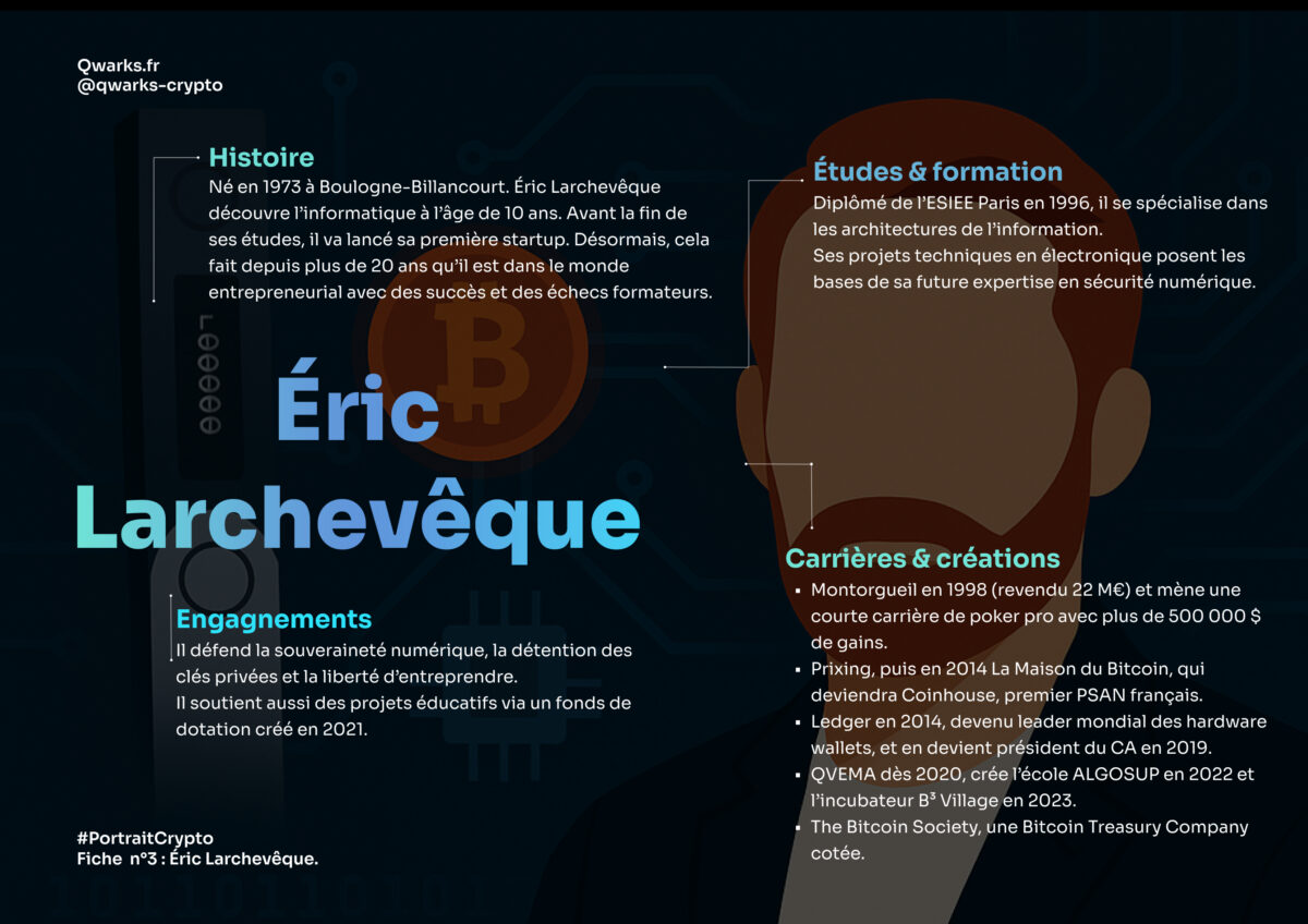 Toujours en 2014, Éric Larchevêque cofonde Ledger, société spécialisée dans la sécurisation des actifs numériques. Ledger s’impose progressivement comme l’un des leaders mondiaux des hardware wallets, en structurant l’usage du secure element pour la protection des clés privées.