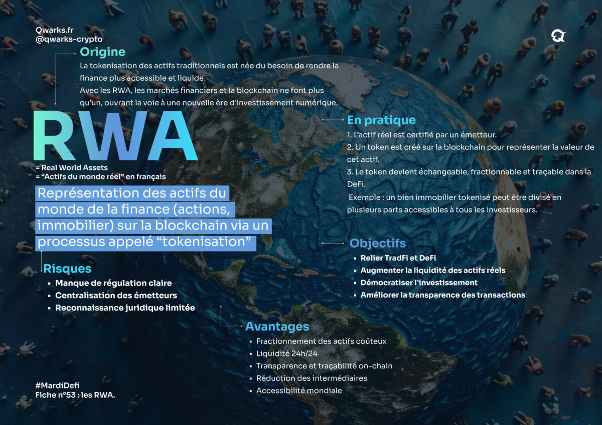 Les Real World Assets (RWA) sont des actifs financiers ou physiques du monde réel (immobilier, obligations d’État, actions, métaux, œuvres d’art, etc.) qui ont été tokenisés, c’est-à-dire représentés sur la blockchain sous forme de tokens numériques.