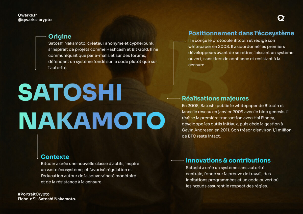 Satoshi Nakamoto est le pseudonyme mystérieux derrière la création de Bitcoin. Son identité, qu’il s’agisse d’une personne ou d’un groupe, demeure inconnue. Il s’exprimait dans un anglais impeccable, alternant entre orthographe britannique et américaine, signe probable d’un brouillage volontaire.