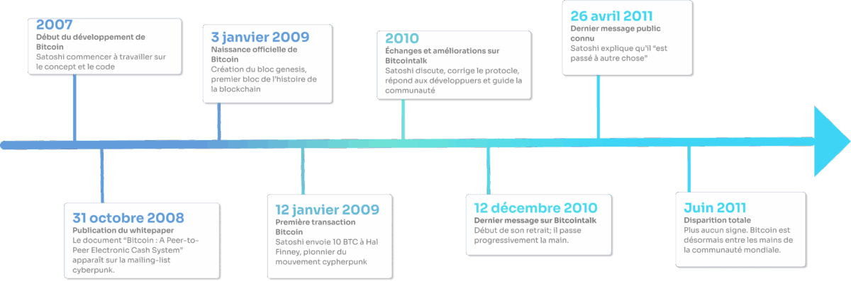 Développeur, cryptographe et cypherpunk, Satoshi participait activement aux discussions sur les mailing-lists dédiées à la cryptographie. Inspiré par les travaux de Hashcash (Adam Back), b-money (Wei Dai), Bit Gold (Nick Szabo) et les systèmes d’horodatage, il a toujours prôné la primauté du code sur les individus, se méfiant de toute figure centrale.